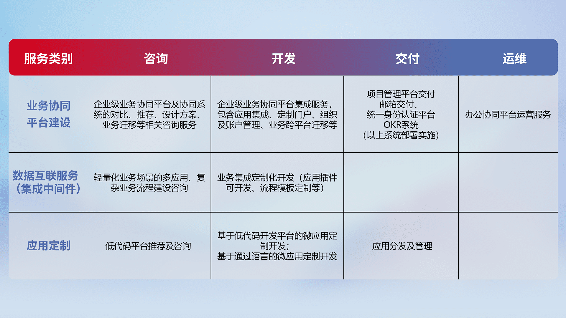 针对钉钉、、、、企微、、、、IDaas等平台级产品提供产品的规划、、方案、、交付、、定制化开发等服务,,,,实现如统一协同办公、、、智能客户服务、、、、混合会议管理、、、智能数据查询、、等业务场景,,,,实现数字化转型。。。