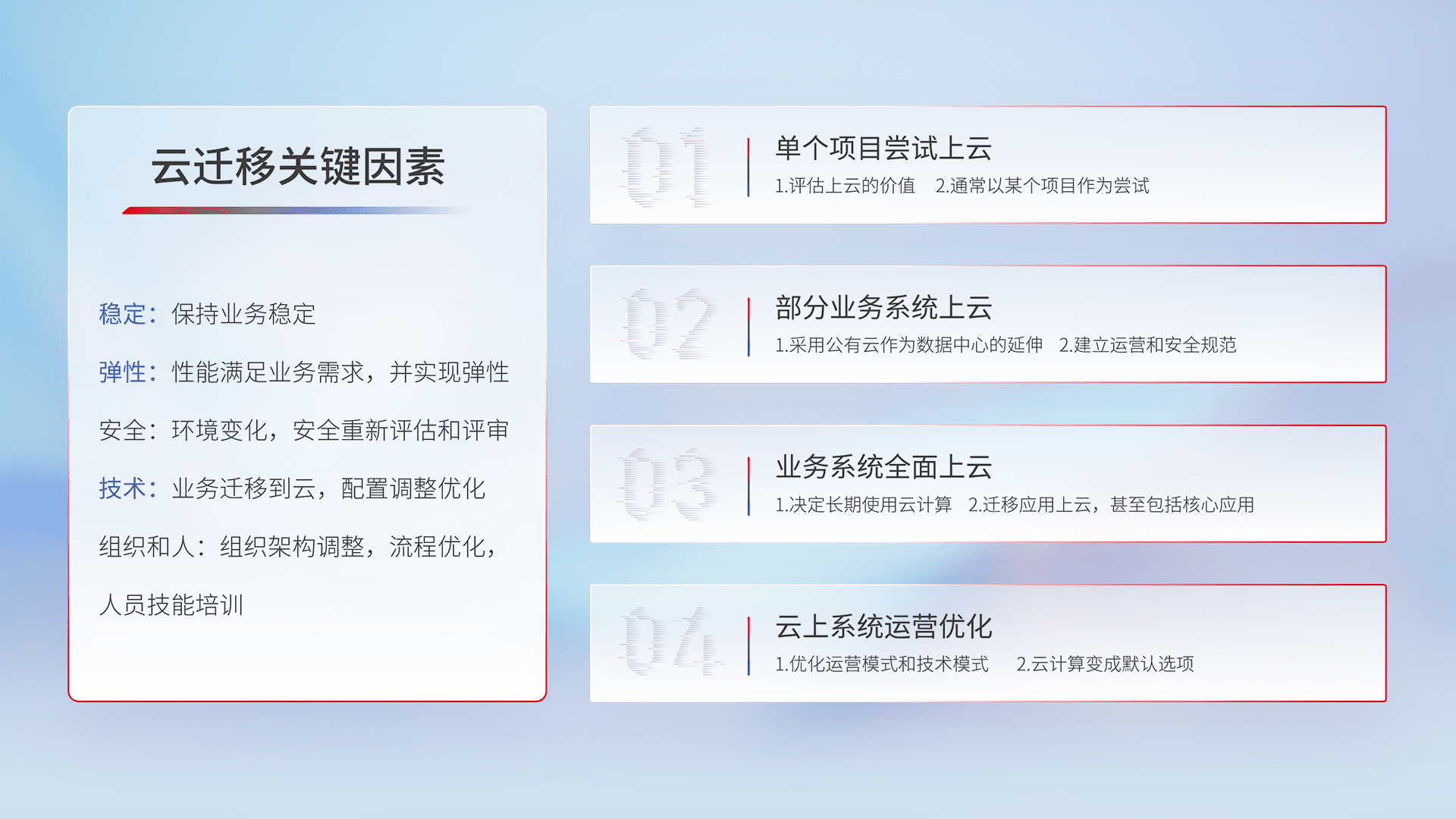 结合实际业务,,,从规划设计、、云平台选型、、云原生改造、、、数据迁移、、、集成交付,,迁移全过程为客户识别最佳上云路径,,做好风险识别管理,,设计网络架构、、、、身份权限、、、、安全审计合规、、、操作审计、、日志审计、、监控告警策略、、、多站点容灾设计等,,,,对云上基础设施进行整体规划,,,提升IT治理水平,,以满足弹性、、、、高可用、、高性能的需求。。。