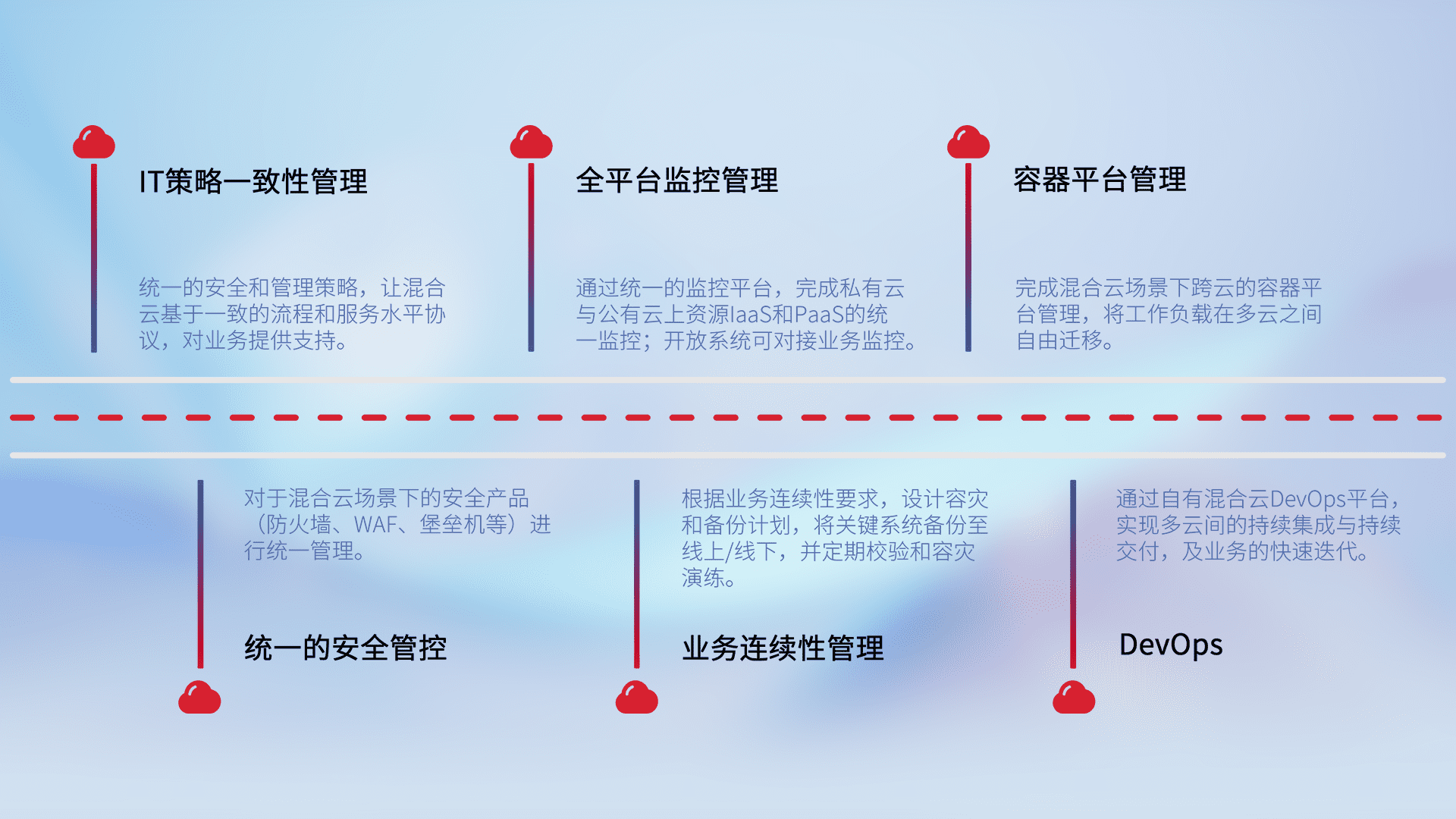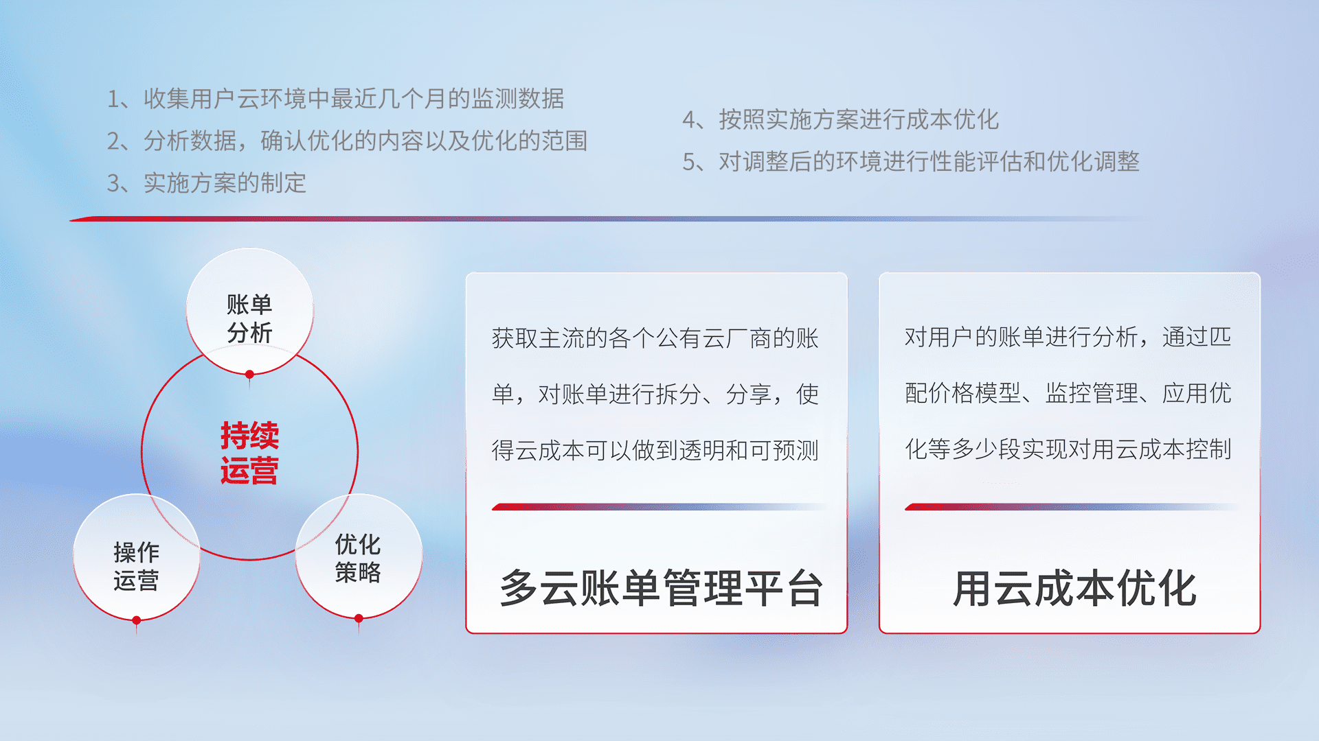 通过多云纳管,,,,以统一的资源数据模型把客户的云资源进行抽象和封装,,进而实现对多云资源的统一操作,,保障云资源管理的可靠性、、稳定性与可用性。。。。量身定制化运维内容,,,,配置、、、、开发运维、、补丁管理、、备份、、、监控、、、认证和访问管理、、审计和日常巡检等,,,保障在用云过程中的可靠度,,,,稳定度以及高可用率。。